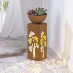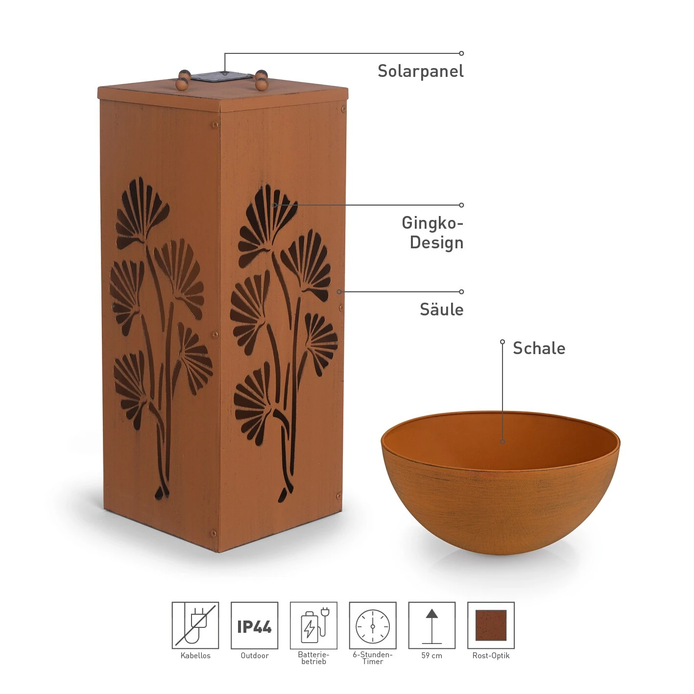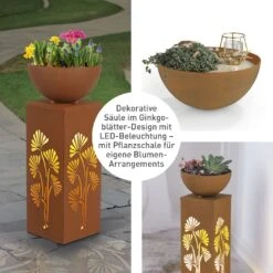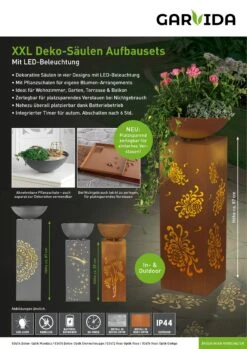 Die GARVIDA” Deko-SĂ€ule mit Pflanzschale und LED-Beleuchtung wird Sie bei Tag und Nacht begeistern! Die Pflanzschale bietet Platz fĂŒr Ihre ganz eigenen Blumen- und Pflanzenarrangements. Lassen Sie Ihrer KreativitĂ€t freien Lauf! Die SĂ€ule selbst ist mit ihrer angesagten Rost-Optik und dem feinen GinkgoblĂ€tter-Design ein echter Hingucker fĂŒr jedes Ambiente. Mit der zuschaltbaren LED-Beleuchtung fasziniert die “GARVIDA” Deko-SĂ€ule mit Pflanzschale gerade im Dunkeln noch mehr. Dank der integrierten Timerfunktion schaltet sich die Beleuchtung nach 6 Stunden automatisch wieder aus. Die “GARVIDA” Deko-SĂ€ule mit Pflanzschale ist batteriebetrieben, sodass Sie die dekorative SĂ€ule unabhĂ€ngig von Steckdosen nahezu ĂŒberall platzieren können – auch im Garten, auf der Terrasse oder dem Balkon. Sie ist fĂŒr den Innen- und AuĂenbereich gleichermaĂen geeignet. Die Pflanzschale ist abnehmbar und auch separat zur Dekoration verwendbar. Mit leichter Aufbauanleitung. IP44.