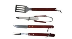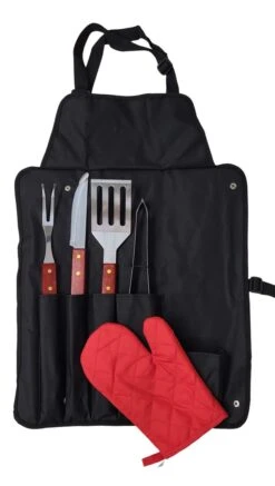 Das Grillset besteht aus Grillschürze, Grillhandschuh, Grillzange, Grillwender und Fleischgabel.