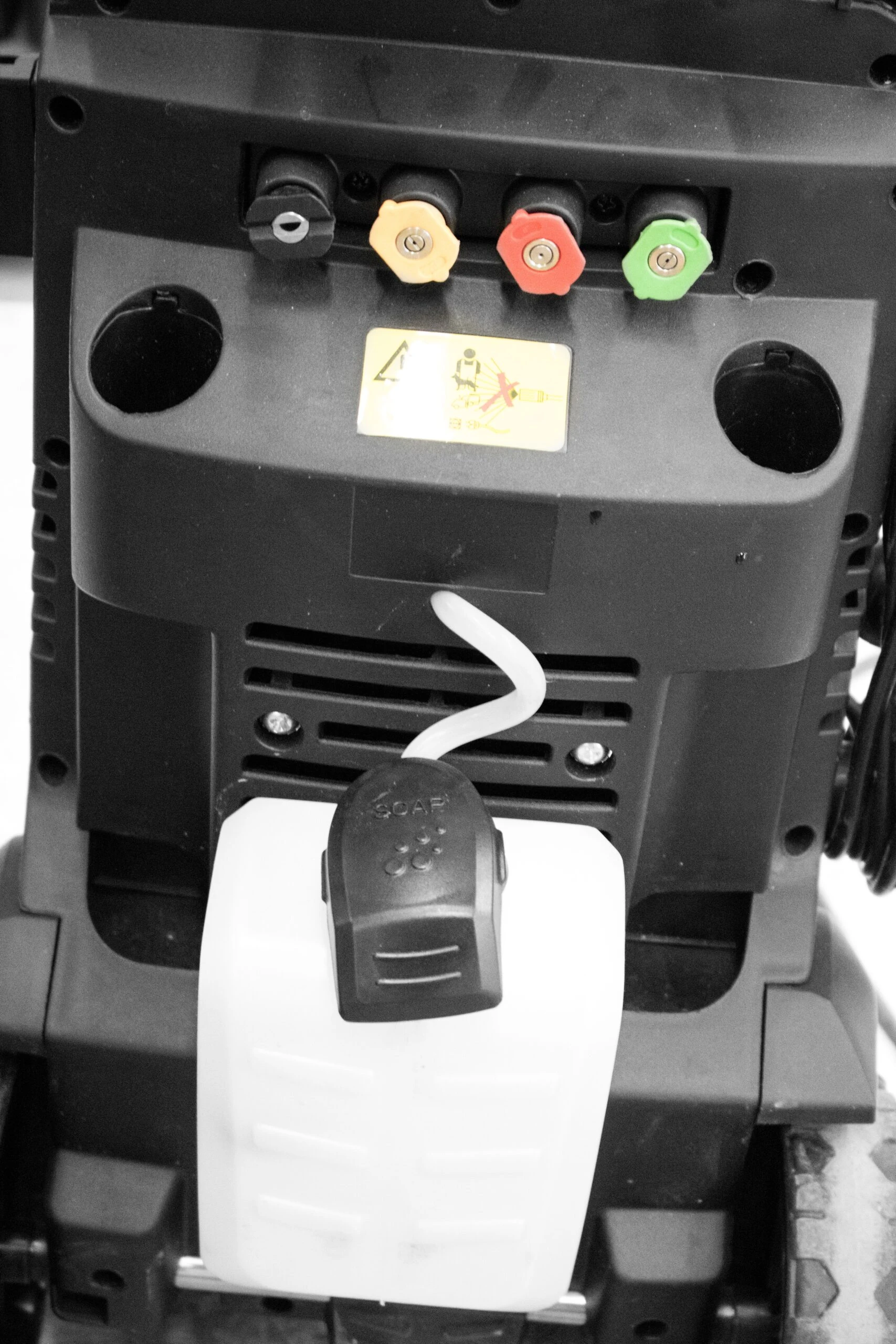 - Praktische Halterungen rund um den Hochdruckreiniger für Zubehör, Hochdruckschlauch und Anschlusskabel