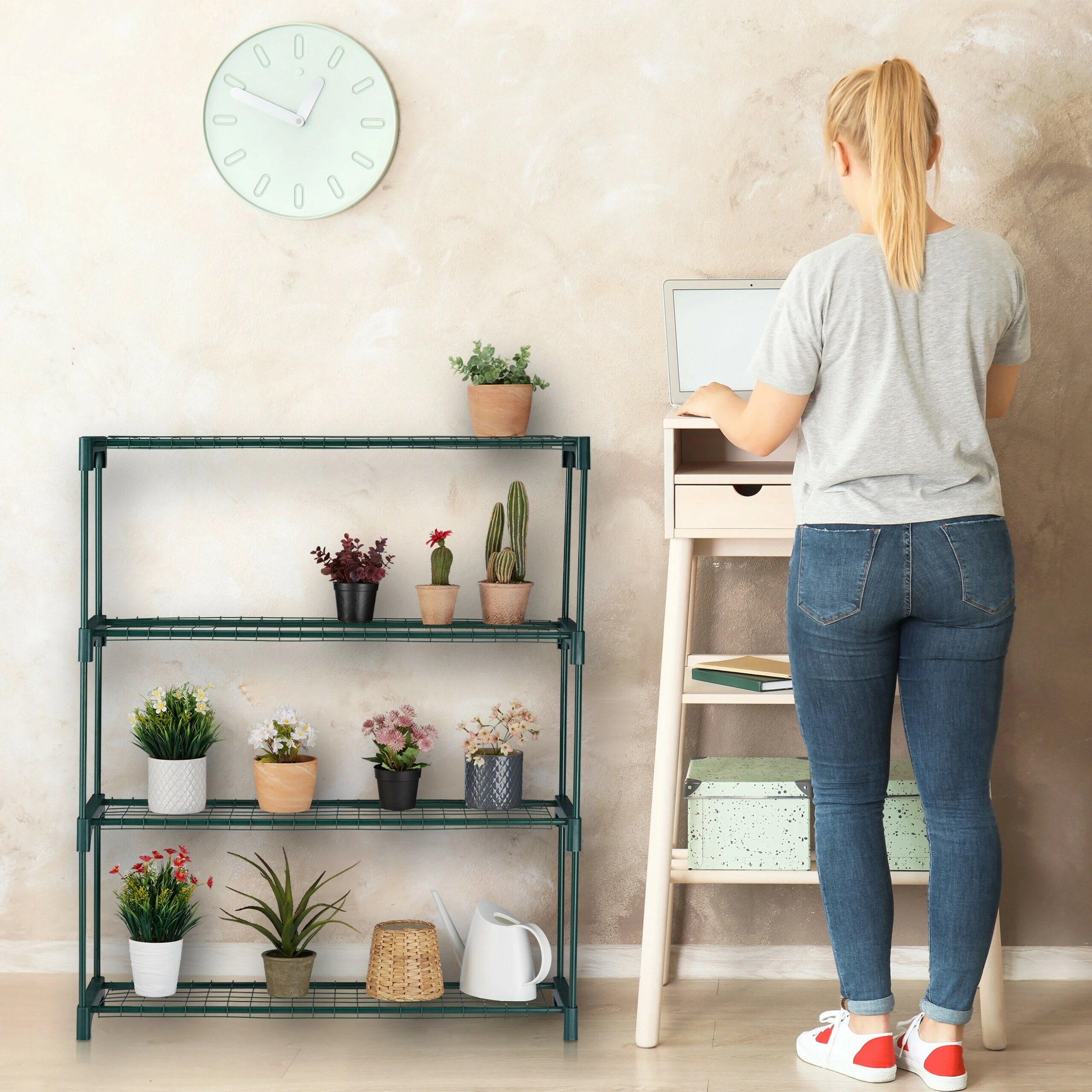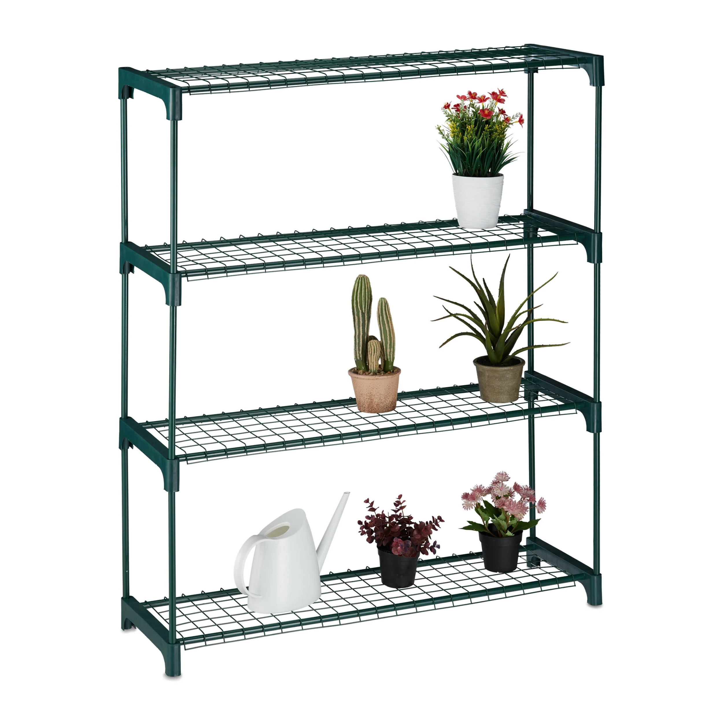 Die Pflanzenbank schafft endlich den nötigen Platz, um Ihre geliebten Blumen und Pflanzen dekorativ zu präsentieren. Gestalten Sie Ihre persönliche kleine Pflanzenecke in Ihrer Wohnung. Die grüne Pflanzentreppe besteht aus Kunststoff und vier Gitterablagen aus Metall. Das schlichte Design der Blumenbank fügt sich überall gut ein. Der Aufbau geht dabei kinderleicht von der Hand – einfach Zusammenstecken, schon ist das Pflanzregal einsatzbereit.