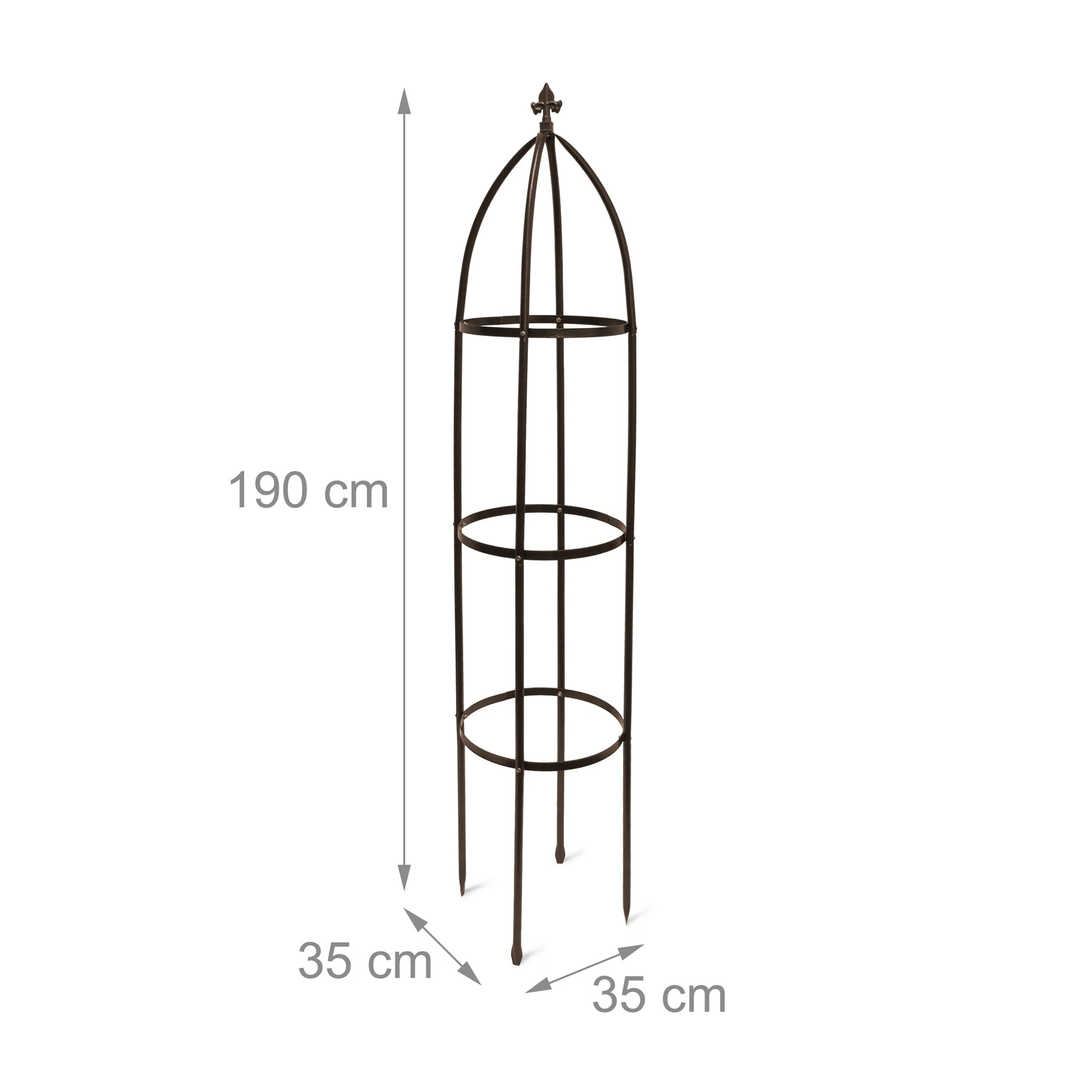 Die freistehende Rankhilfe Obelisk aus Metall ist ein wunderschönes Gartenaccessoire. Lassen Sie die Ranksäule mit Kletterrosen, Efeu oder Wein bewachsen und genießen Sie die dekorative Blumenpracht. Das 190 cm hohe Rankgerüst wird mit seinen spitzen Füßen ca. 30 cm tief in den Boden eingegraben. So ist ein stabiler Stand für Ihre Pflanzen gewährleistet. Die Rankhilfe kommt in Einzelteilen. Indem Sie Elemente weglassen, können Sie die Größe variieren. So kann der Obelisk mit Ihren Pflanzen mitwachsen.
