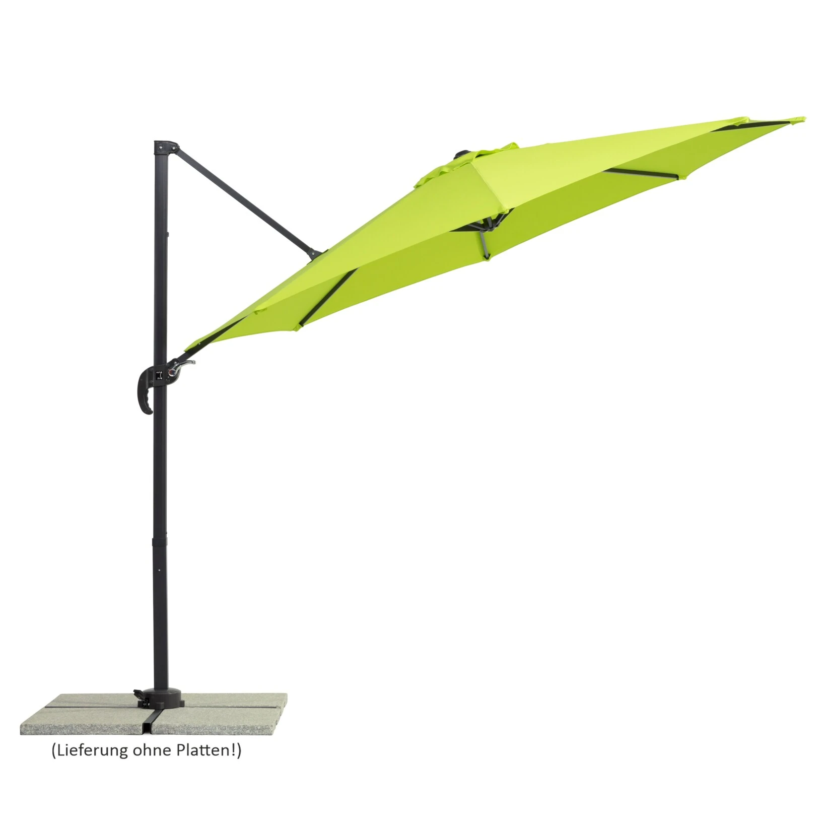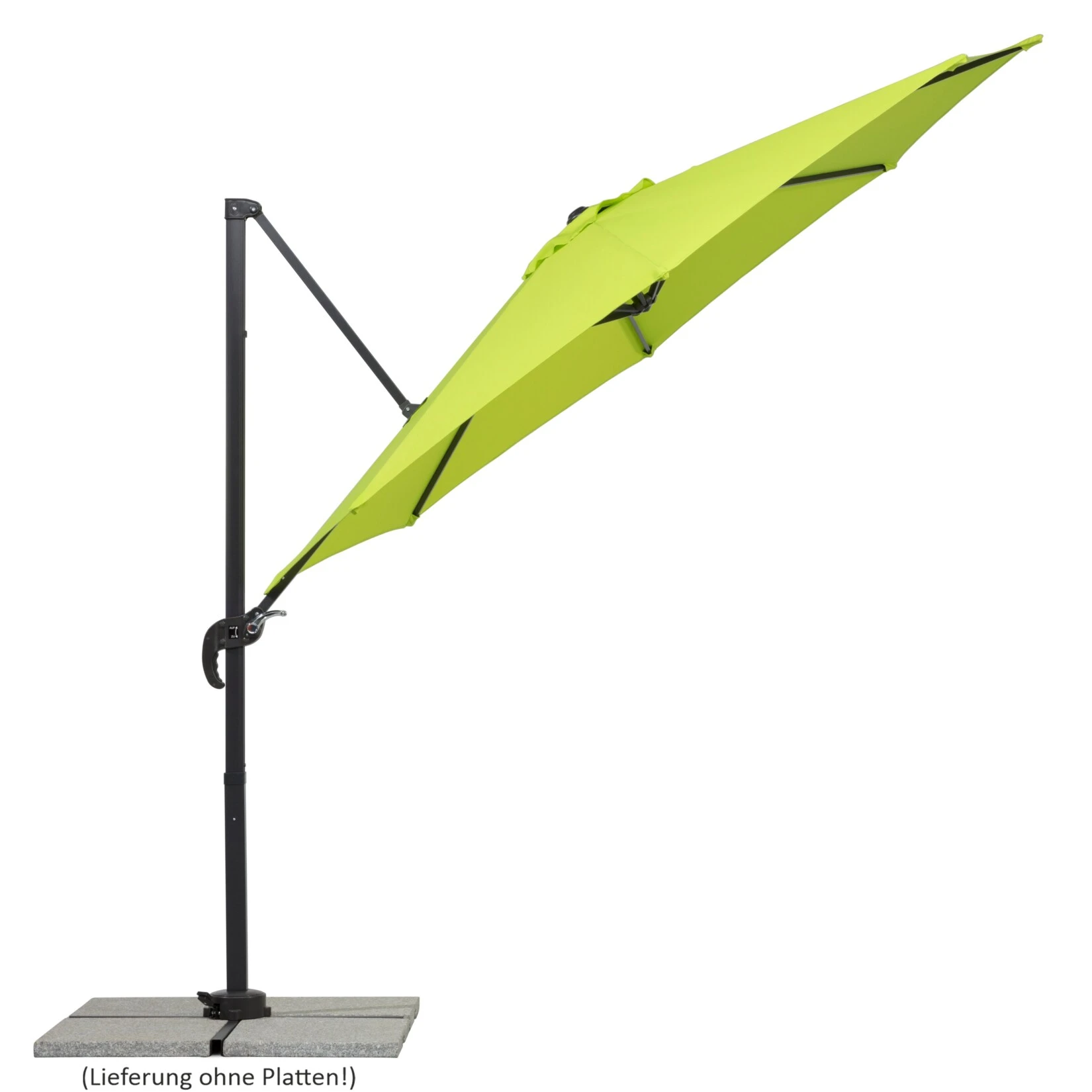 Das Alu/Stahl-Gestell ist anthrazitgrau pulverbeschichtet und passt somit optisch sehr gut zur Bespannung. Der Schirm verfügt über ein massives Drehgelenk mit Fußpedal.
