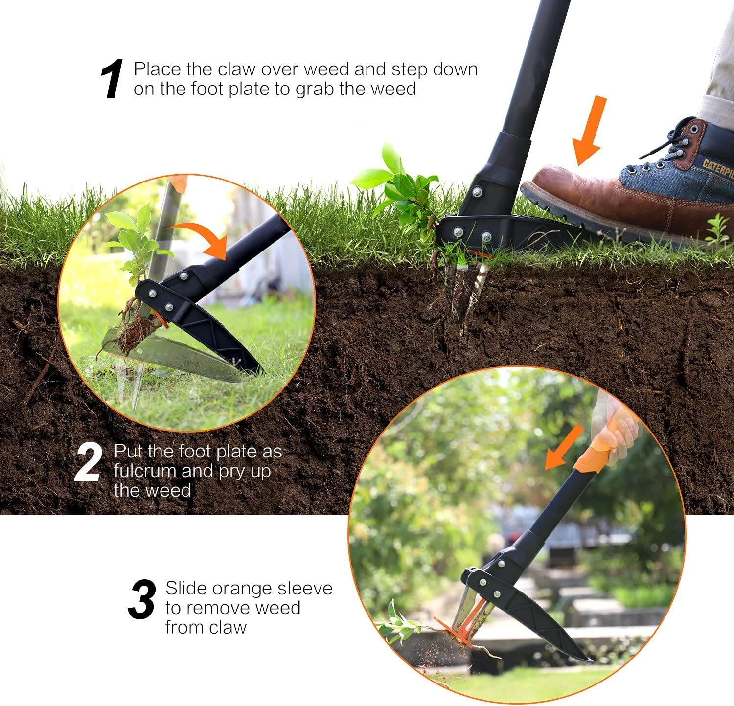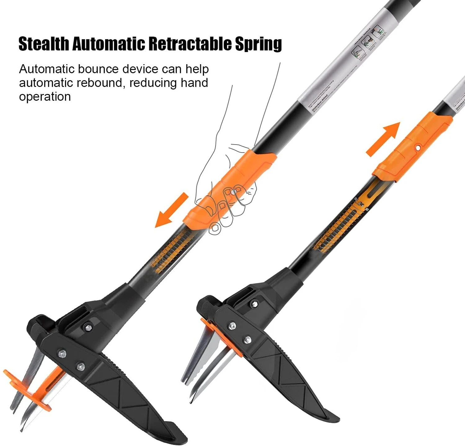 EINFACHE REINIGUNG – Die automatische Federvorrichtung des aktualisierten Unkrautjäters ermöglicht es Ihnen, Unkraut und Schmutz zu entfernen, indem Sie nach dem Ziehen von Unkraut einfach den beweglichen Griff in der Mitte drücken, was die Reinigung der Edelstahlkralle ohne Kraftaufwand einfacher und schneller macht