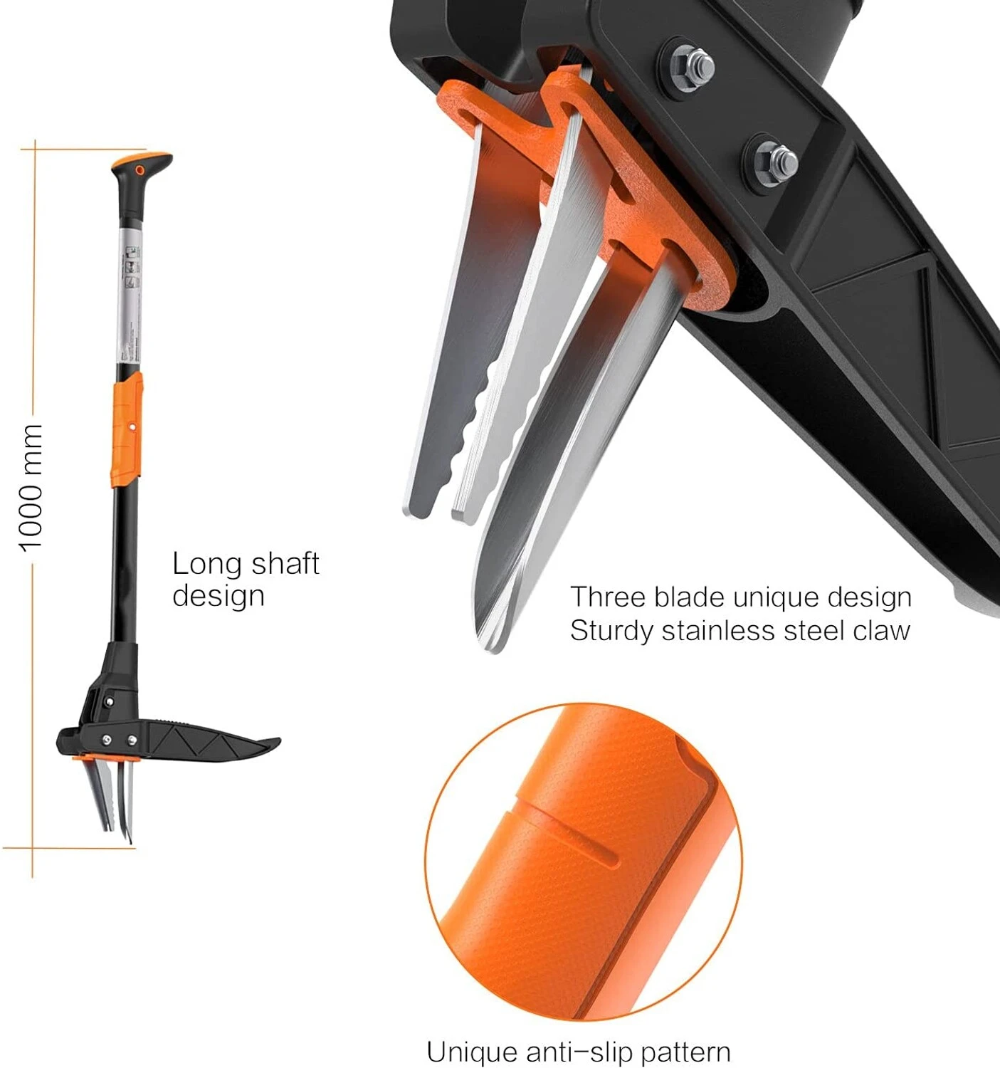Innovative Struktur – Das 0,4 cm dicke und 8,3 cm lange Edelstahldreikrallen-Design der manuellen Unkrautjäter verbessert den Griff und die Stabilität. Die hochfesten Edelstahl-Pedale können Ihr Gewicht problemlos tragen und ermöglichen es Ihnen, in den harten Boden einzudringen, um Unkraut zu entfernen. Der 99,1 cm große Unkrautjäter ist für Menschen unterschiedlicher Körpergröße geeignet, wodurch Knie- und Taillenschmerzen durch häufiges Biegen vermieden werden